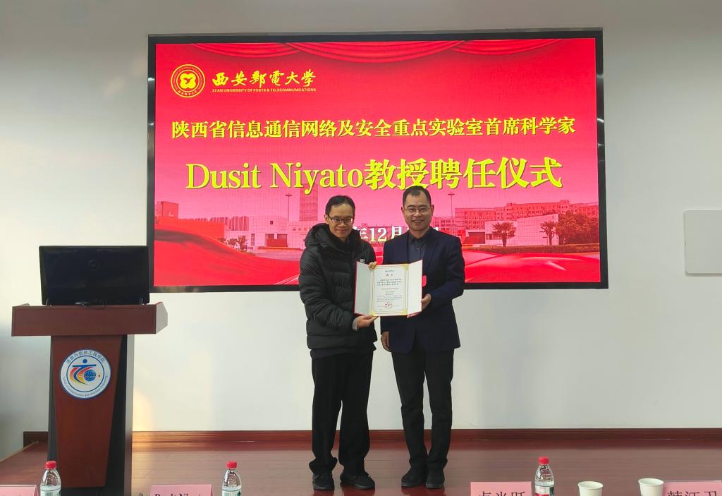 (通讯员 杨会杰)12月19日上午,我校举行陕西省信息通信网络及安全重点实验室首席科学家Dusit Niyato教授聘任仪式暨专家报告会。新加坡南洋理工大学Dusit Niyato教授、广东工业大学康嘉文教授、吉林大学孙庚教授及南洋理工大学青年学者代表,我校校长卢光跃,人事处、通信与信息工程学院负责人及师生代表参加仪式。聘任仪式由副校长韩江卫主持。